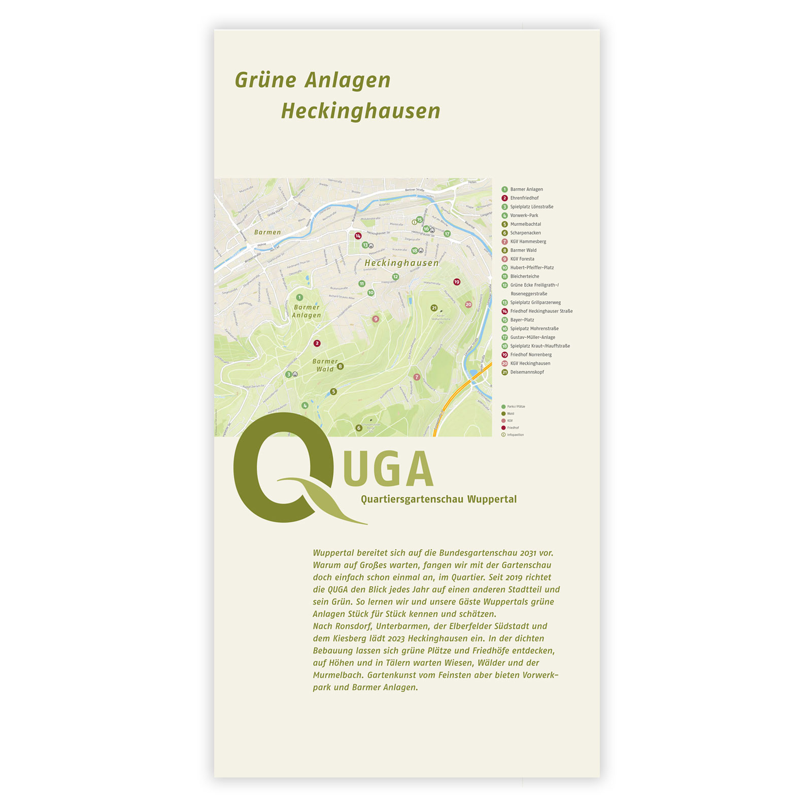 Wuppertal bereitet sich auf die Bundesgartenschau 2031 vor. Warum auf Großes warten, der Förderverein fängt mit der Gartenschau einfach schon einmal an, im Quartier mit dem Grün, das schon da ist. Jedes Jahr richtet die Quartiersgartenschau, in bester Klangverwandtschaft kurz QUGA, den Blick auf einen anderen Stadtteil. Die Aktiven laden ein und zeigen öffentliche Parks und private Gärten, Wälder, Friedhöfe und Besonderheiten ihres Quartiers.